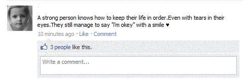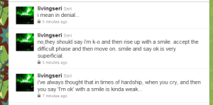 cry + smile + ok = strength? January 17, 2011June 7, 2012 / livingseri i was disturbed by this so called quote. my response: Share this: Click to share on X (Opens in new window) X Click to share on Facebook (Opens in new window) Facebook Like Loading... Related